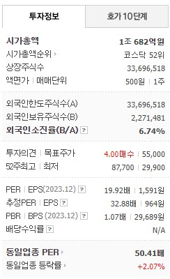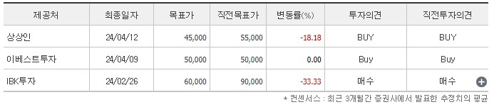 이베스트투자증권에서는 목표가를 5만원으로 잡고 있네요. 그나마 IBK 증권이 제일 많은 6만원을 제시했습니다.