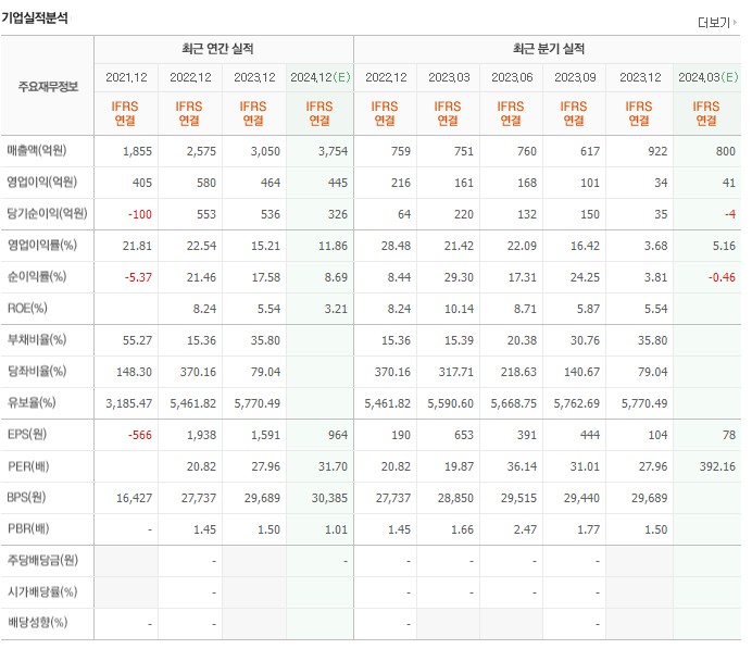 2021년에는 적자를 기록했지만, 매년 매출액이 늘어나고 있으며, 당기순이익,영업이익도 나름 안정적입니다. 영업이익률도 생각보다 높네요. 작년에는 15% 였는데, 올해는 11.86%로 예상됩니다.