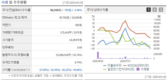 시가총액은 1조 382억으로 코스닥 52위에 랭크되어있습니다. eps는 1,591원이고 per은 19배 정도 됩니다. 다른 이차전지 per이 50 으로 비교했을때 괘 낮은 per 입니다.