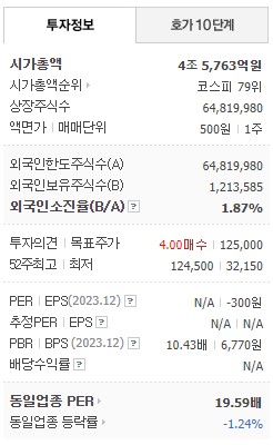 시가총액은 4조 5,763억원이고, 코스피 79위에 랭크 됩니다.
