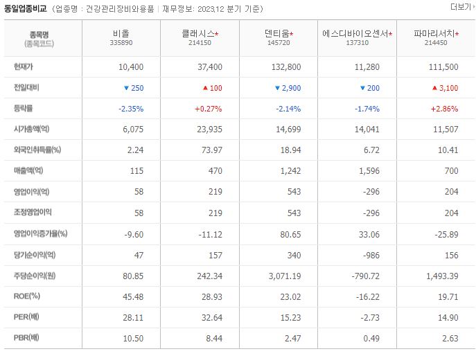 그렇다면 다른 피부미용기기 동일업종과 살짝 비교를 해보겠습니다. 클래시스, 덴티움, 파마리서치 등 모두 좋은 기업들만 모여 있네요. 이 기업들도 비올과 같이 영업이익률이 굉장히 높은 기업 들입니다.