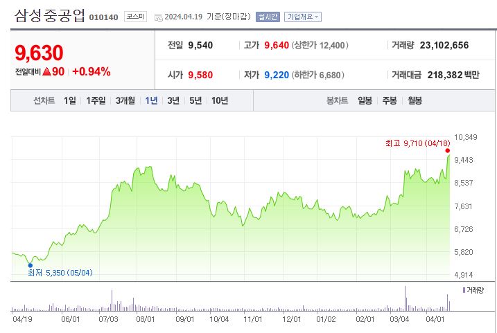 지난 1년 동안 삼성중공업의 주가는 다소 변동성이 있었으나 전반적인 상승 추세를 유지하고 있습니다. 최저가와 최고가의 차이는 상당히 크며, 최근에는 경제 회복 기대감과 주요 수주 소식이 주가를 지지하고 있습니다.