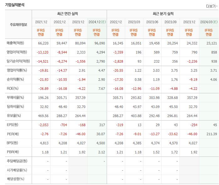그러나 재무제표 상의 일부 지표는 여전히 도전적인 상황을 나타냅니다. 2023년 3분기의 자기자본이익률(ROE)은 -4.88%, 부채비율은 328.68%로 여전히 높은 편이며, 영업현금흐름 또한 마이너스를 기록했습니다.