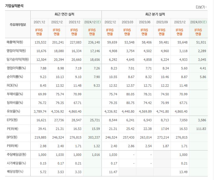 최근 연간실적, 분기실적을 보면 꾸준히 우상향 하고 있는걸 볼 수 있습니다. 영업이익률도 7~8%로 안정적이네요.
