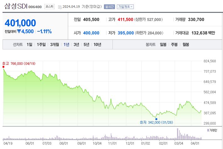 최고 766,000원 최고가를 기록 한 후 계속 하락하여 최저가 342,000원까지 갔다가 지난 종가는 40만원에서 마감되었습니다. 요즘 테슬라 주가도 연일 하락하고 있는데.. 이차전지 사업 분야에 큰 조정의 그림자가 들어온 것으로 파악됩니다.