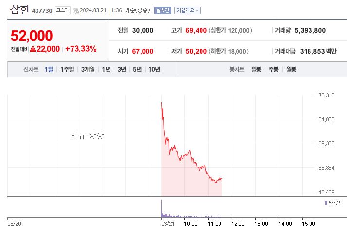 3월 21일 목요일은 삼현 공모주 상장일입니다. 많이 기대하셨을 텐데요, 생각보다 힘이 약한 느낌이 듭니다.