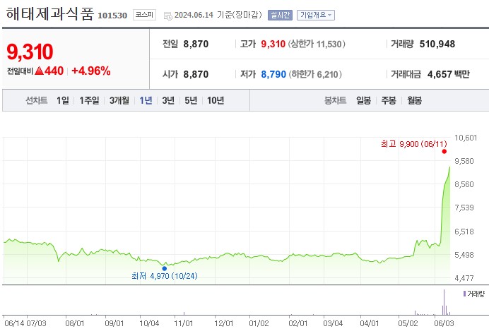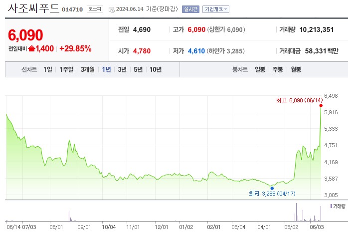 최근 식품 관련주들이 큰 시세를 내고 있으며, 특히 삼양식품, 크라운제과, 해태제과식품, 국순당, 에스앤디, 사조대림, 사조산업, 사조씨푸드 등 여러 기업들이 상한가를 기록했습니다.