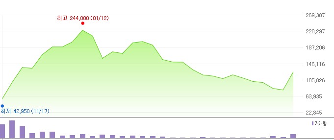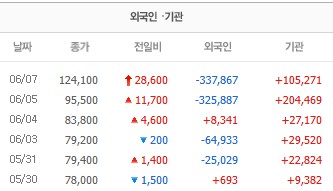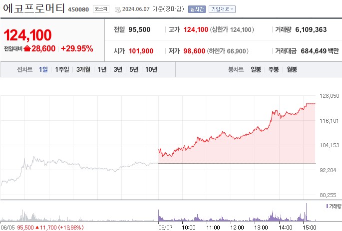 지난 마지막 거래일이었던 6월7일 금요일 29.95% 상승한 상한가를 기록하였는데요, 장마감 종가는 28600원 상승하여 124,100원을 기록했습니다.