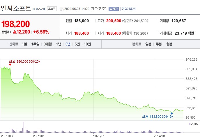 엔씨소프트 주가는 2024년 6월 25일 최고 200,500원을 기록했으며, 2023년 4월 19일 최저 163,600원을 기록했습니다. 주가는 전반적으로 하락 추세를 보였으나, 최근 반등하는 모습을 보이고 있습니다.
