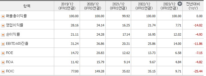 영업이익률은 2021년 16.25%, 2022년 21.73%, 2023년 7.71%로, 당기순이익률은 2021년 17.14%, 2022년 15.71%, 2023년 12.02%로 나타났습니다.