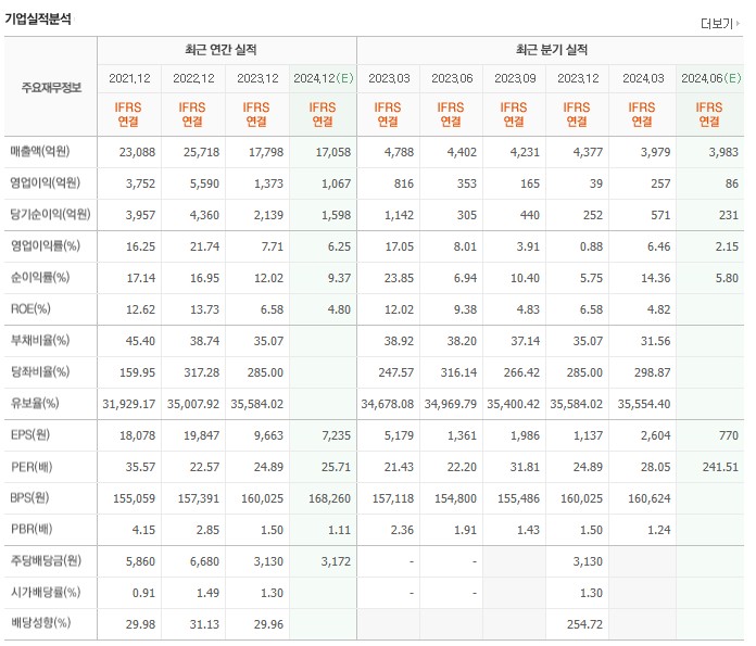 ROE는 2021년 12.62%, 2022년 13.82%, 2023년 6.58%로, 수익성이 다소 감소하는 추세를 보이고 있습니다. 부채비율은 2021년 25.40%, 2022년 27.18%, 2023년 35.07%로 안정적인 수준을 유지하고 있습니다.