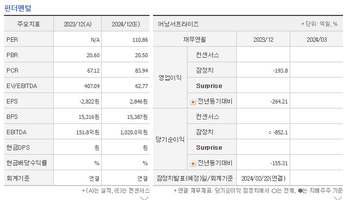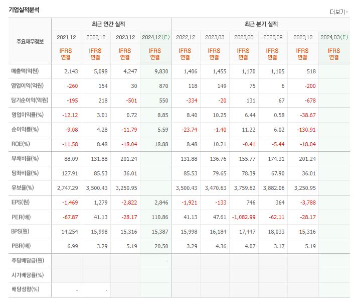 그러나 당기순이익은 68.3% 감소하였는데, 이는 재무 구조의 변화와 시장 조건에 따른 것으로 해석됩니다. 현재 재무 상 흐름은 좋지 않지만 2024년 올해에는 유의미한 재무제표 개선이 있을 것으로 예상되고 있습니다.