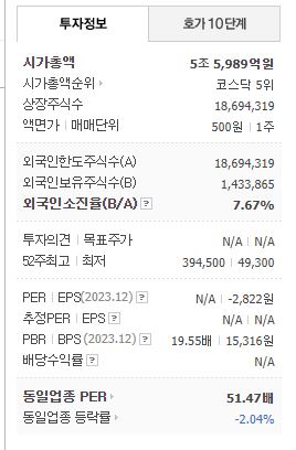 시가총액은 코스닥 기준으로 5위이며, 5조 5,989억원입니다. 처음 이 기업을 접 했을때 시가총액이 몇 천억 수준이었는데 5조를 넘었다니.. 정말 대단하네요.. 원더풀!!