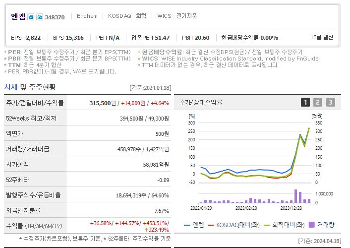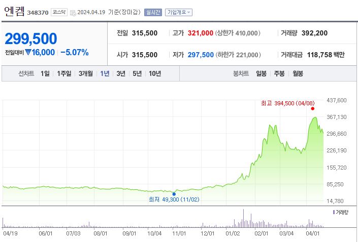 2024년 주가 상승 흐름이 가장 큰 기업인 엔켐. 요즘도 그 흐름이 꺽이지 않고 있습니다. 많이 보유하고 계신가요? 상당히 많은 수익을 올린 분들이 많은 걸로 알고 있는데.. 완전 부럽습니다!!