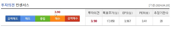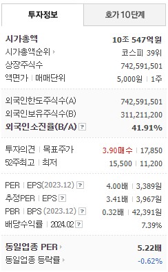 시가총액은 10조 547억원으로 코스피 39위에 랭크되어 있습니다. 동일업종 PER 은 5.22배를 받고 있습니다.