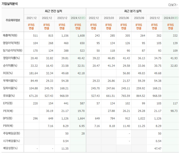 2021년: 매출액과 이익이 크게 개선되며 영업이익률은 20.40%, 순이익률은 33.32%로 전환되었습니다.