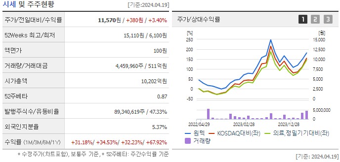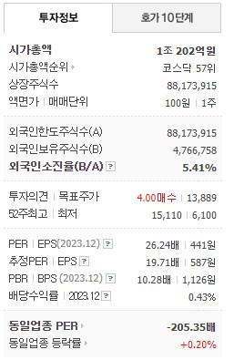 시가총액은 1조 202억원으로, 시총순위로 보면 코스닥 57위에 해당됩니다. 100위권내에 진입하다니 정말 대단한걸요!!