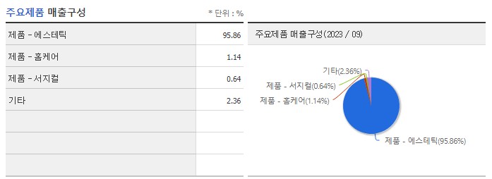 매출구성을 살펴보면 에스테틱 부분에서 거의 모든 매출이 나오고 있습니다.