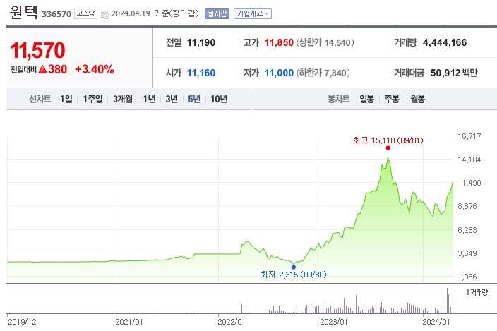그 중심에는 [원텍] 기업이 있는데요, 1만원대 주가대를 형성하다가 요즘 엄청 올랐더라고요? 무슨일이 있나? 실적이 엄청좋게 나올것이라는 얘기가 있는데, 아마 그 영향때문인 것으로 추정됩니다.