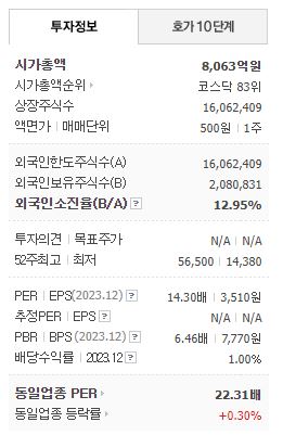 현재 시가총액은 8,063억원으로 시가총액 상으로 코스닥 83위에 랭크되고 있습니다. 얼마전까지만 해도 100위안에 들지 못했는데, 시총이 엄청 많이 늘어났네요!
