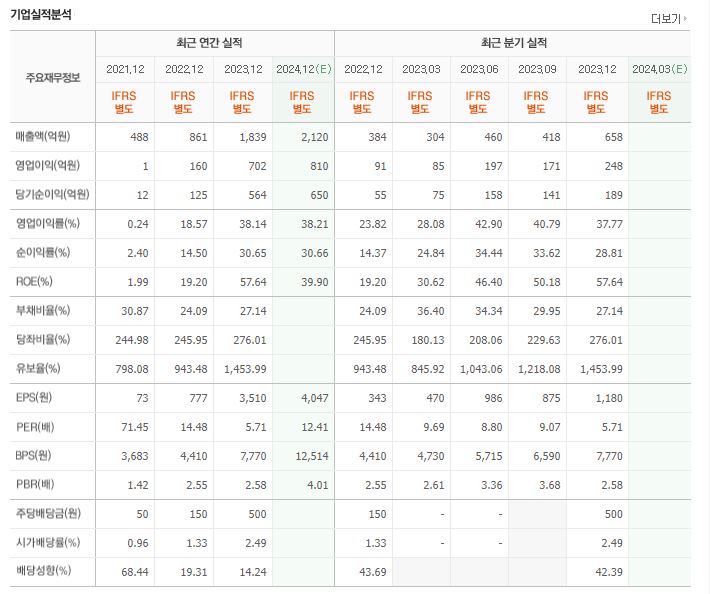 매출액만 봐도 꾸준히 늘어나고 있으며 영업이익, 당기순이익도 안정적으로 늘어나고 있습니다. 영업이익률도 38%대로 매우 높습니다. 부채비율,당좌비율,유보율까지 매우 안정적인데요?