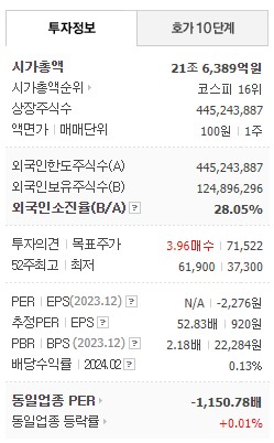 정확히는 21조6,389억원으로 시총 기준 코스피 16위에 랭크됩니다. 매우 큰 기업임이 틀림없습니다.