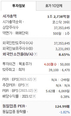 시가총액은 1조 2,738억원이며, 코스닥 랭크 39위 입니다. 이렇게 막강하게 커질 줄이야.. -0-;