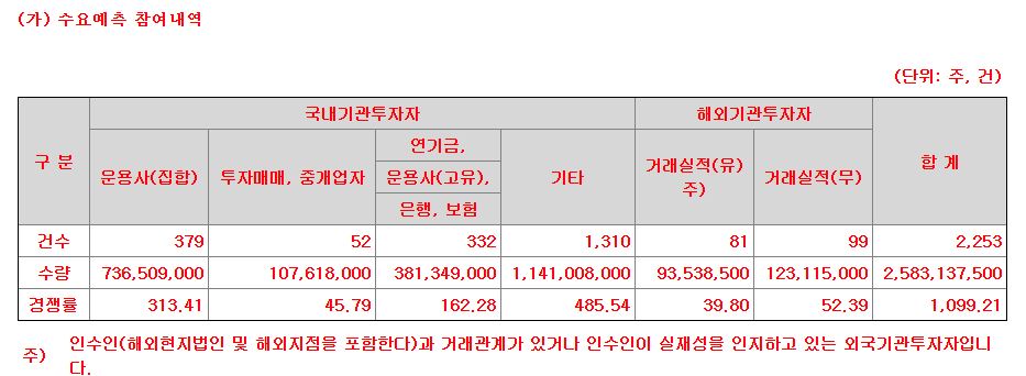 기관 수요예측결과를 보면 국내외 기관 2253곳이 참여하여 1099.2대1의 높은 경쟁률을 기록했습니다.