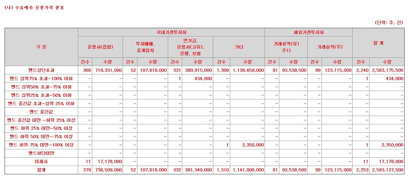 우선 간단하게 수요예측 결과부터 확인해보겠습니다. 기관 경쟁률도 알아야 하니까요.