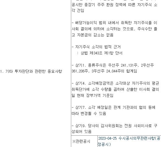 배당가능이익 범위 내에서 취득한 자기 주식을 이사회 결의에 의하여 소각하는 것으로 주식수만 줄고 자본금의 감소는 없다니~ 정말 훌륭합니다!