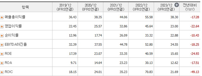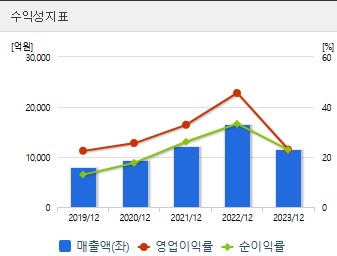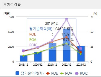 ROE는 기업이 자기 자본을 얼마나 효율적으로 사용하고 있는지를 나타내는 지표입니다. ROE는 2021년과 2022년에는 높았으나 2023년에는 감소할 것으로 예상됩니다. 이는 매출 및 이익의 변동성과 관련이 있습니다. 영업이익률도 비슷한 패턴을 보이며, 이는 회사의 수익성에 영향을 미칩니다.