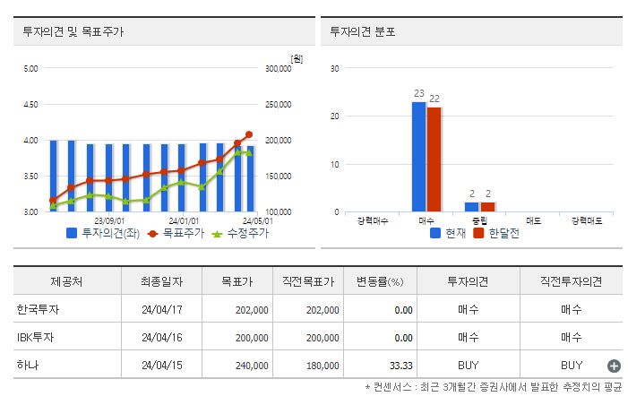 현재 SK하이닉스의 주식에 대한 증권사들의 평균 목표주가는 207,400원입니다. 이는 주식의 현재 가격 대비 상당한 상승 여력을 내다보고 있는 것으로, 향후 반도체 시장의 회복과 기술 개발에 대한 기대감이 반영된 것으로 보입니다.