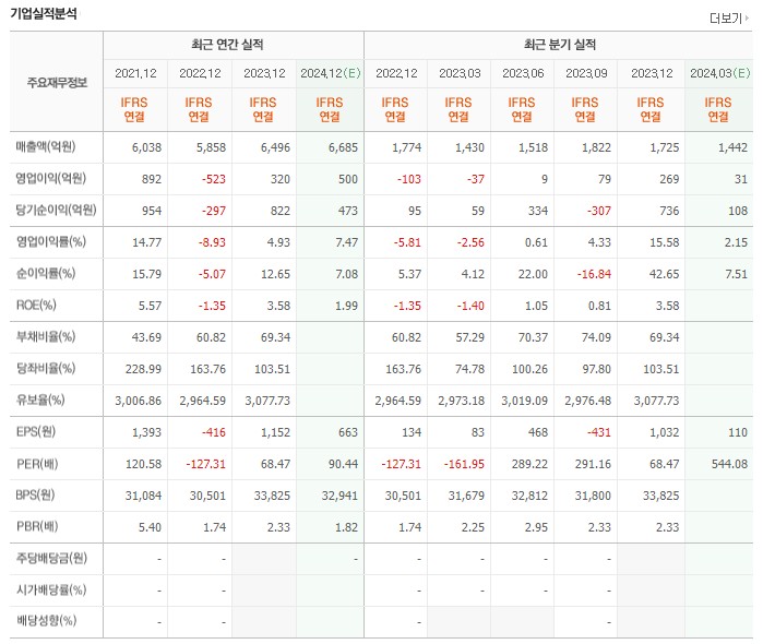 우선, 매출액의 큰 변화는 감지되지 않네요. 약 6천억 정도의 매출을 발생시키고 있습니다. 한 때 적자였지만 바로 흑자로 전환하였고, 올해 영업이익률은 약 7% 로 예상되고 있습니다.