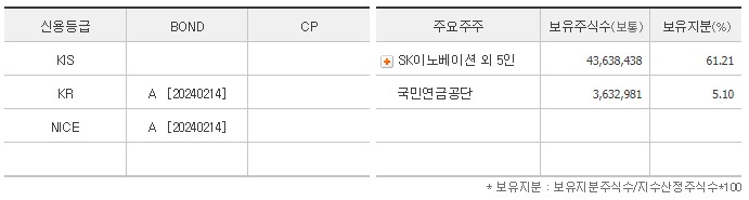 주요주주를 살펴보면, SK이노베이션 외 5인이 61%정도를 차지하며, 국민연금공단의 지분율도 약 5.1%가 됩니다.